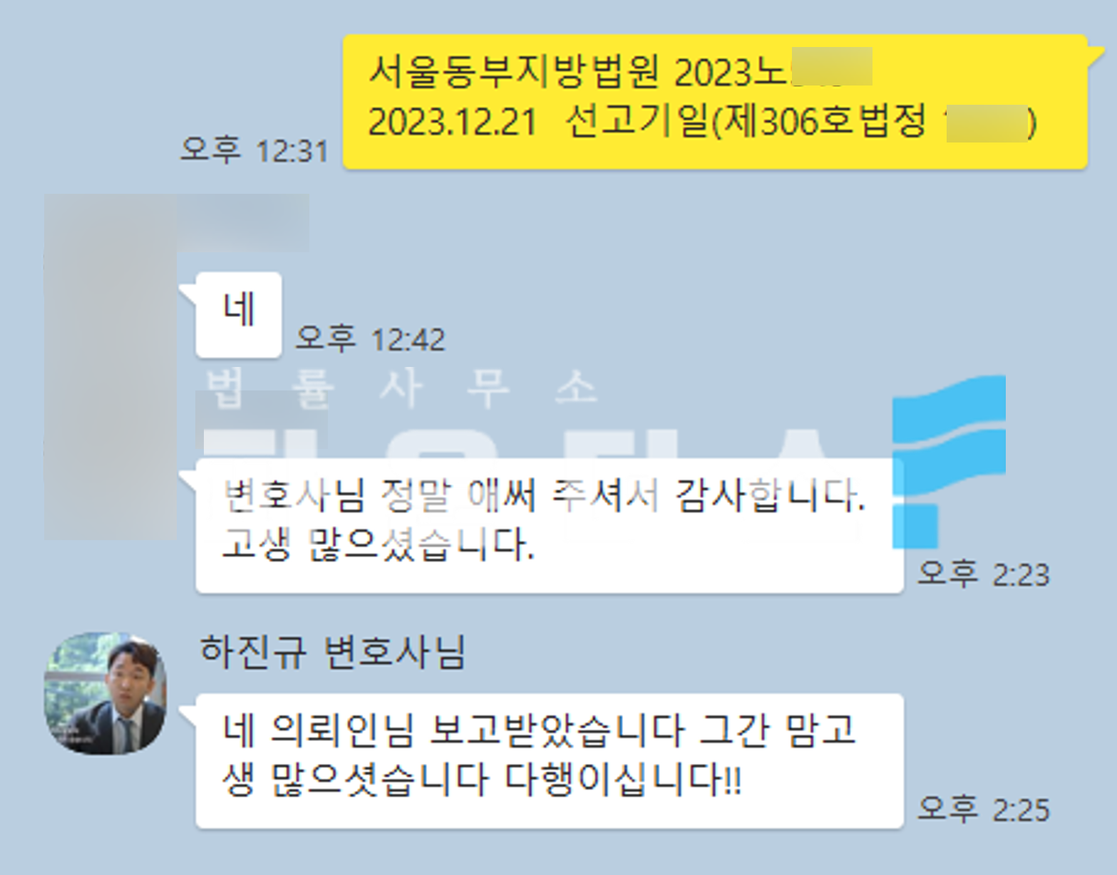 이와 같이 정리된 내용을 재판장에서 적극적으로 변론하였고 재판을 마친 이후 변론요지서 작성을 통해 최후 진술 및 변론에 힘을 싣는 변론활동을 하였고 의뢰인에 대한 무죄를 주장하였습니다.