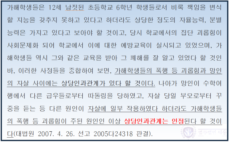 피해자에게는 안타까운 일일 수 있지만 학폭이나 괴롭힘을 당한 피해자들이 스스로 목숨을 끊는 경우가 다수는 아니니까요. 단순히 국민감정에 반한다거나 죽어 마땅한 놈이라는 이유로 인과관계를 인정할 수는 없는 것입니다.