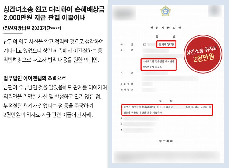 이 같은 변호사의 꼼꼼하고 타당한 소장에 이를 담당한 인천지방법원은 상간녀에게 2천만원의 위자료를 의뢰인에게 지급할 것을 판결하였습니다. 이와 같은 에이앤랩의 조력으로 의뢰인은 조금이나마 위로를 받을 수 있었습니다.