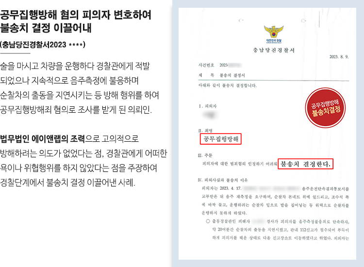 그 결과 충남당진경찰서는 이러한 변호사의 주장을 인정하였고 불송치 결정을 받아낼 수 있었습니다.