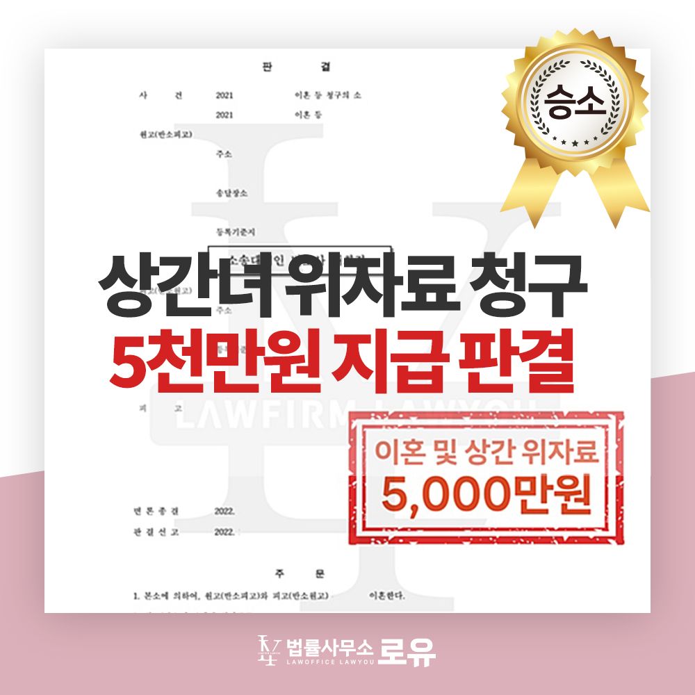 로유의 변호인이 증거자료와 진술 등을 바탕으로 부정행위가 있었음을 강력히 주장한 끝에 싱간녀 손해배상 청구 소송에서 5.000만원 위자료 지급 판결이 나게 되었습니다.