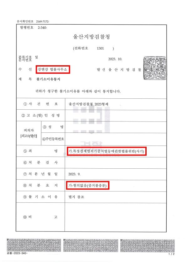 이에 울산지방검찰청에서는 저희 의견을 받아들여 피의자들에게 불기소(혐의없음)처분을 내렸습니다.