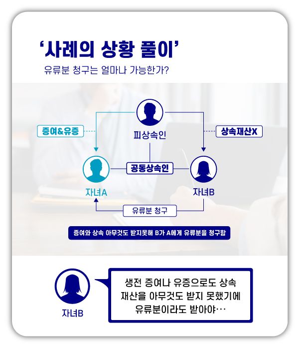 이는 현행 민법상 보장되어 있는 법적 권리로 위 사례처럼 아버지가 A 씨에게만 재산을 증여하였고 A 씨에게만 남은 상속재산을 물려주겠다는 유언을 남겼어도 남매인 B 씨는 유류분의 제도에 따라 일정 부분을 상속받을 수 있는 것입니다.