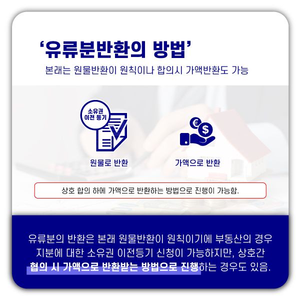 그러나 만일 원고와 피고가 서로 동의한다면, 즉 위 사례에서 A 씨가 동의한다면 아파트 지분 대신 그에 상응하는 현금 3억 원을 반환받는 것으로 서로 합의할 수 있습니다.