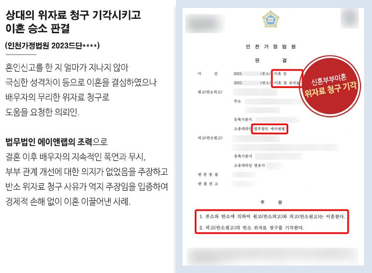 그 결과 사건을 담당한 인천가정법원에서는 변호사의 주장을 인정해주었는데요. 의뢰인과 배우자의 이혼 및 배우자의 위자료 청구는 기각하는 판결을 해주었습니다. 이와 같은 에이앤랩의 조력으로 의뢰인은 경제적 손해 없이 신속하게 이혼하는 판결을 받을 수 있었습니다.