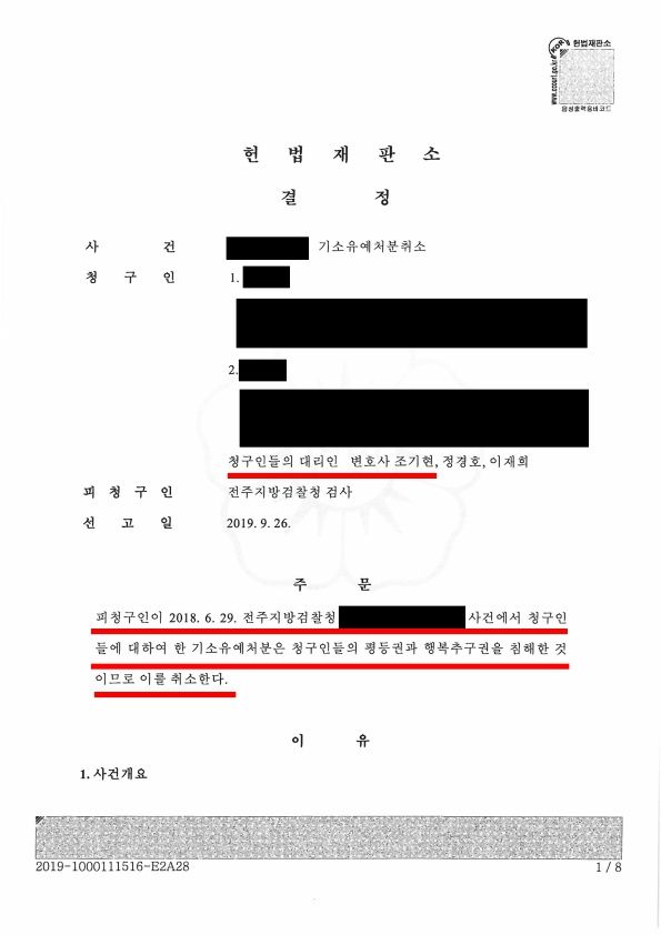 헌법재판소는 조기현 변호사의 주장을 받아들여 의뢰인 부부에게 내려진 검사의 기소유예처분을 취소하는 결정을 하였습니다.