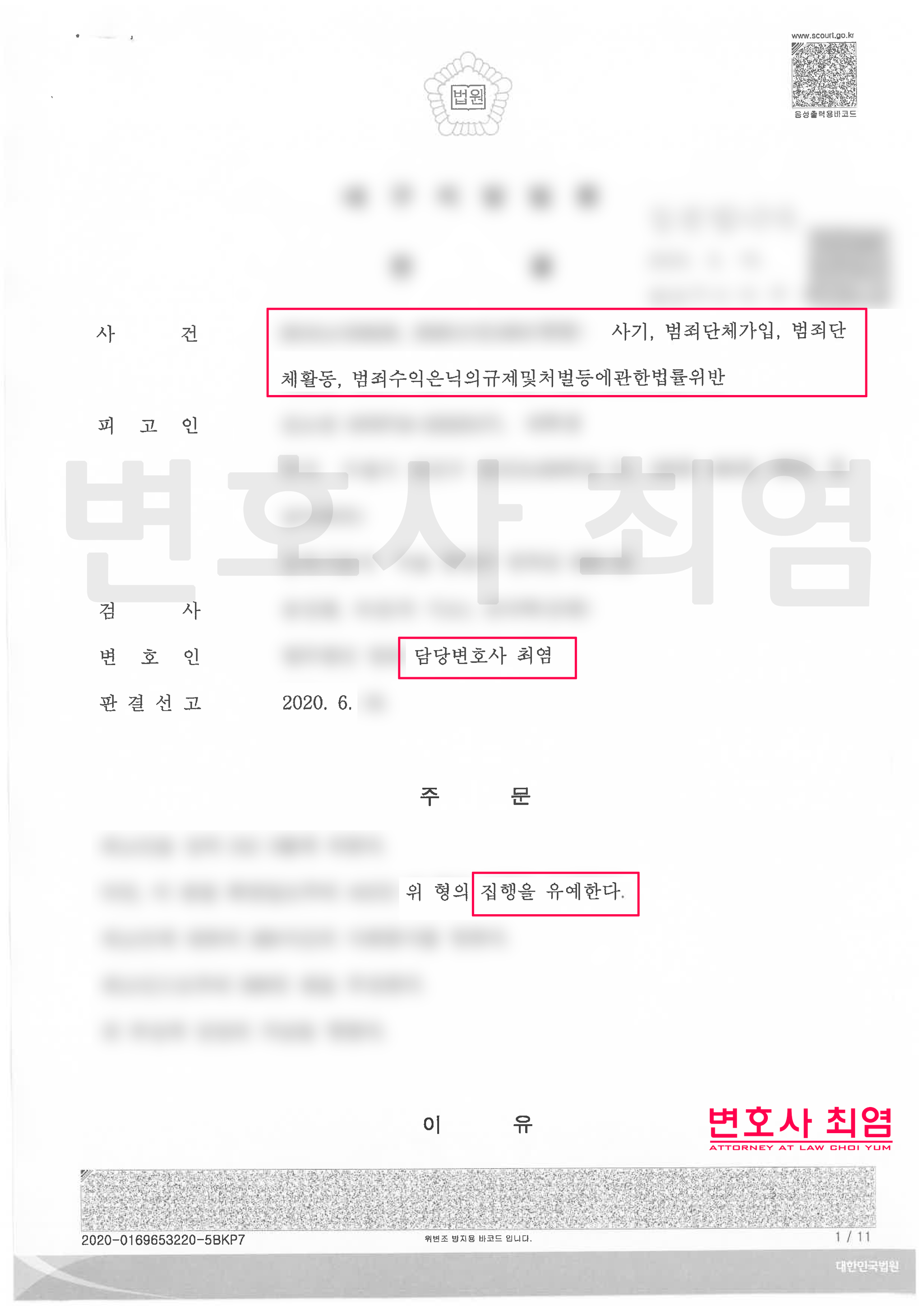 또한 이사건을 통해 의뢰인이 취득한 수익이 많지 않고 친구가 다른나라로 데려가며 도주하게되었으나 스스로 자진하여 입국해 조사를 받은 점, 진행하며 피해자와 원만하게 합의를 하여 피해자가 선처를 구하고 있고 가족들이 선처를 하는 등 이런 범죄에 연루되지 않도록 선도를 다짐하고 있는 점 등으로 적극 선처를 호소하였고 법원은 피고인에게 집행유예를 선고하였습니다.