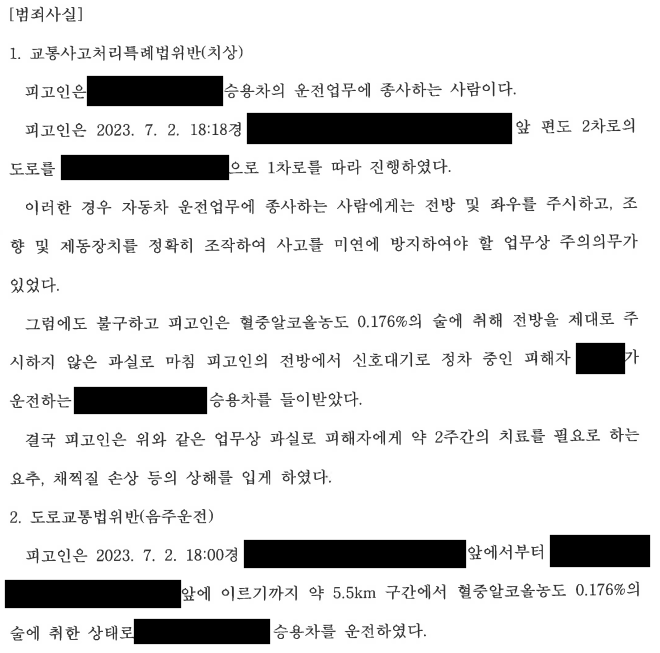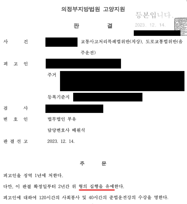 의뢰인은 주취상태로 운전하던 중 신호대기로 정차 중이던 차량을 충격하고 피해자에게 약 2주간의 치료를 요하는 상해를 입게 하였습니다. 수사기관은 의뢰인에 대하여 교통사고처리특례법위반(치상) 및 도로교통법위반(음주운전)의 혐의로 공소를 제기하였습니다. 이에 의뢰인은 실형이 선고될 수 있는 어려운 상황을 헤쳐나가고자 부유에 도움을 요청하였습니다.