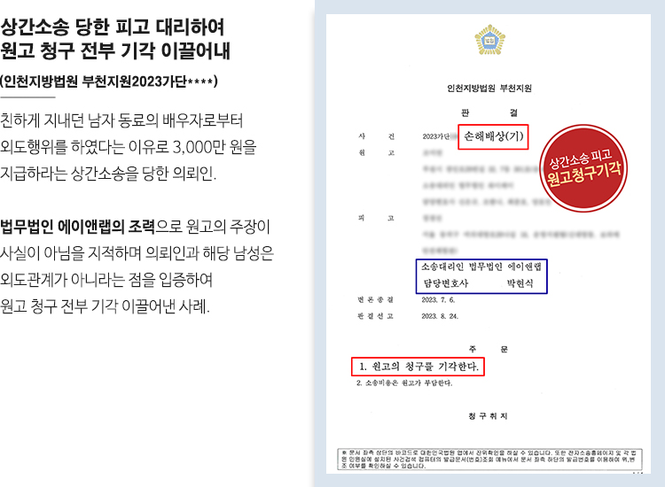 이로써 의뢰인은 억울한 상간녀 누명에서 벗어날 수 있게 되었습니다.