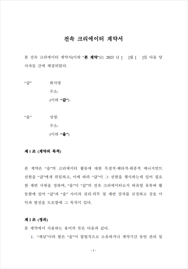 일반적으로 전속계약서들은 인터넷 검색을 통해 찾을 수 있는 공정거래위원회 제정의 표준계약서를 토대로 작성되는 경우가 많은데, 해당 표준계약서는 일반적인 내용들로 작성되어 있고 개별 사안에서 당사자 사이에서 협의된 사항들을 반영하기에는 불충분한 부분이 존재하는바, MCN회사의 대표님이 전달주시는 사항 및 크리에이터와 사이에 협의된 사항들을 반영하여 각 당사자의 권리 및 의무가 명확하게 규정되는 전속크리에이터계약서를 작성하였습니다.