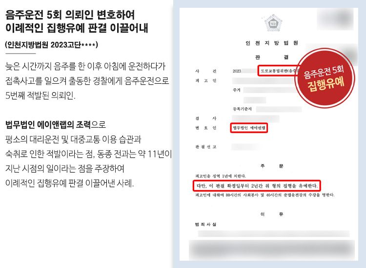 이에 사건을 담당한 인천지방법원에서는 음주운전 5회차 적발 의뢰인에게 이례적으로도 실형이 아닌 집행유예를 선고해주었습니다.