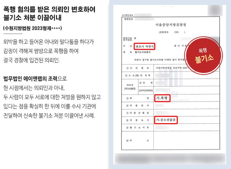 아울러 폭행과 관련된 형법은 물론 사건에 적용되고 있었던 가정폭력범죄의 처벌 등에 관한 특례법을 꼼꼼히 검토하여 서로의 처벌불원의사를 확실히 하였고 이를 수사 기관에 전달하였습니다.