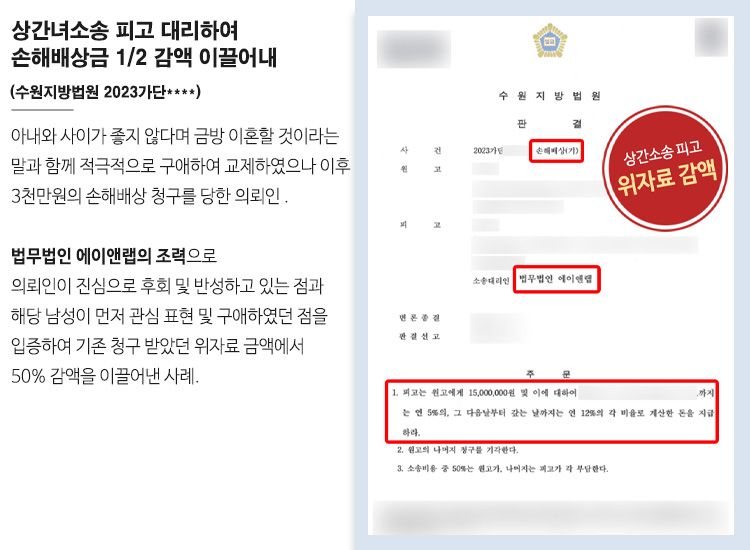 이에 사건을 담당한 수원지방법원에서는 변호사의 주장을 인정하며 기존 청구 금액인 3천만원의 금액에서 50% 감액한 1,500만원만을 지급하라는 판결을 내려주었습니다. 이로써 의뢰인은 과도한 위자료 지급의 위기에서 무사히 벗어날 수 있었습니다.