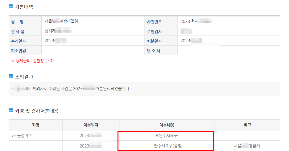 위와 같은 변호 활동을 한 결과, 정정교 변호사는 의뢰인에게 말씀드렸던 바와 같이 검찰로부터 해당사건에 대해 '보완수사요구결정'을 이끌어냈습니다.