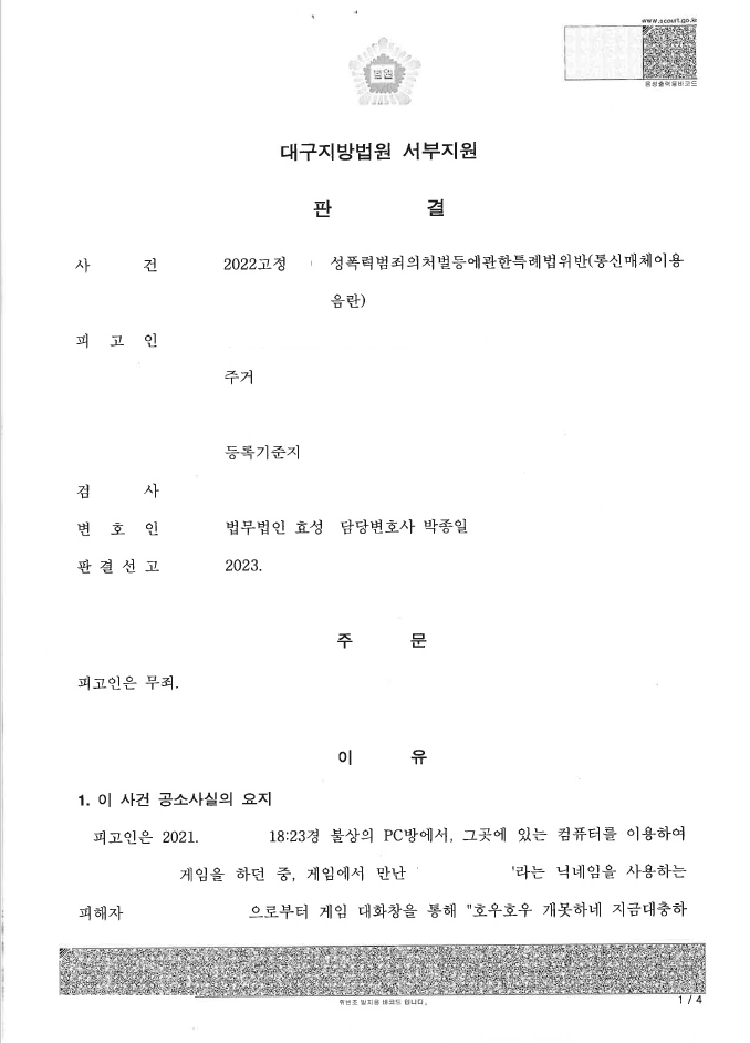 의뢰인은 pc방에서 온라인 게임을 하다가 피해자에게 성적인 저속한 표현을 사용하여 신고당하였고 검사는 의뢰인을 통매음으로 기소하여 급하게 저를 찾아오셨습니다.