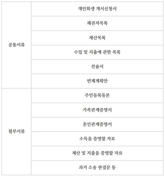 첨부자료는 위와 같으나 실질적으로 입증자료를 같이 제출하여야 하기 때문에 실제 제출하는 서류는 훨씬 많을 수밖에 없습니다. 예를 들어 채권자 목록을 입증자료로 채권자별 부채증명서, 자료 송부서 등 채무의 발생일과 금액 이자 등을 확인할 수 있는 자료를 첨부하여 제출하여야 하며, 재산목록의 경우 보험 예상 해약환급금 내역서, 지적전산자료조회 결과서, 세목별 과세 증명서, 자동차 등록 원부, 임대차계약서, 은행잔액증명서, 부동산등기부 등본 등을 첨부하여 제출하게 됩니다. 소득 증빙자료의 경우 가용소득이 기준이 되는 자료로 근로소득원천징수영수증, 급여명세서, 소득증명원, 부가가치세과세표준증명서, 매출처·매입처별 세금계산서 합계표, 신용카드 매출·매입 집계표, 국민건강보험자격득실 확인서 등을 제출하게 됩니다.