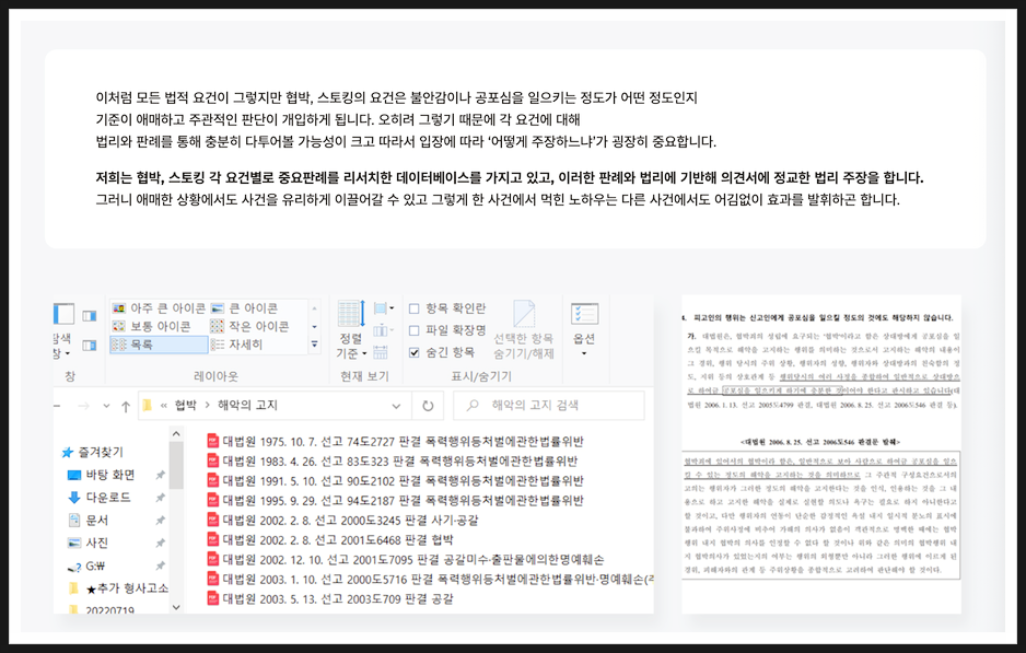 스토킹, 협박 혐의가 애매할 경우 대신하여 많은 고소가 이루어지는 불안감조성죄에서 무혐의를 이끈 사례를 보유하고 있는데요.