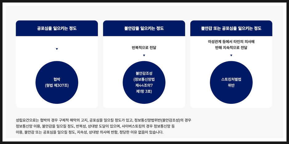 불안감조성죄는 협박과도 다르고, 스토킹과도 비슷하지만 다른 부분이 있어 명확하게 법리를 확인하는 것이 중요합니다.