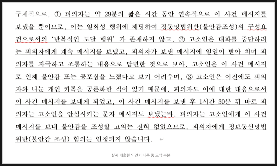 실제로 저희가 위 핵심 법리를 바탕으로 제출한 변호인 의견서 내용 일부를 아래 공유해 드리겠습니다.