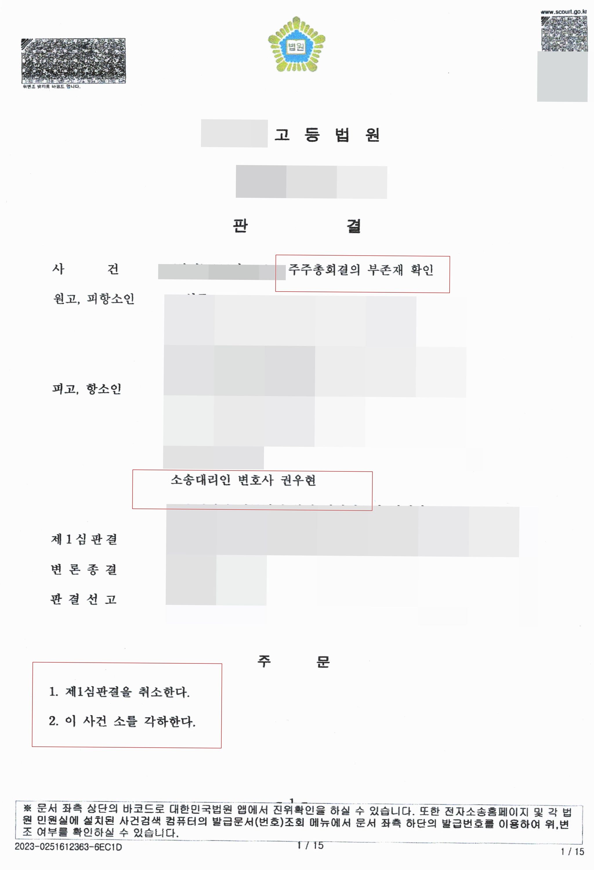 주주총회 결의 부존재 확인 소송에서, 치열하게 다툰 결과 1심 판결을 취소하고, 원고의 소를 각하하는 피고측 승소사례인데, 자세한 내용은 생략하고, 과거의 법률관계 확인청구라도 예외적으로 현재적 잠재적 분쟁을 일거에 해결하는 유효적절한 수단이 되는 경우 확인의 이익이 있으나, 이 사건의 경우 예외적이 사정이 없으며, 설령 확인의 이익이 있다는 전제에서 가정적 본안판단을 하더라도, 당시 대표이사가 이 사건 총회에 참석하지 않은 채 주주총회의사록이 작성된 것으로 보이기는하나, 전원출석 총회이므로 특별한 사정이 없는 한 유효하다는 이유에서, 원고의 본안 청구도 이유 없다고 하여, 결국 1심 판결을 취소하고 원고 청구 각하 즉 피고 측 승소 판결을 내리게 되었다.