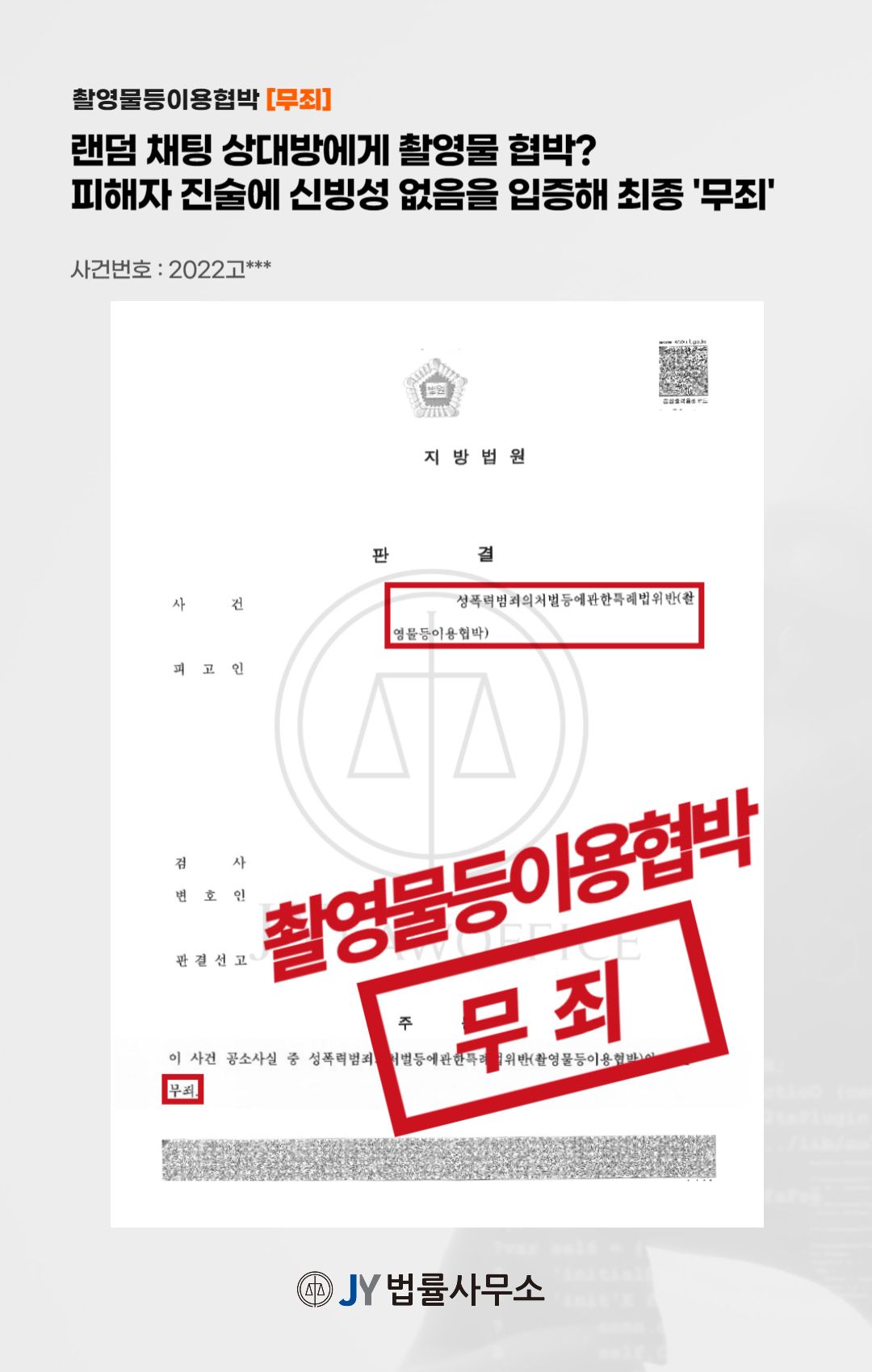 본 사건의 의뢰인은 랜덤 채팅에서 만난 상대방에게 성 관련 영상을 요구 및 협박함으로써 '촬영물등이용협박' 혐의를 받게 되었습니다. 이에 무거운 처분이 두려웠던 의뢰인은 본 JY법률사무소를 찾아 사건을 정식 의뢰해 주셨습니다.