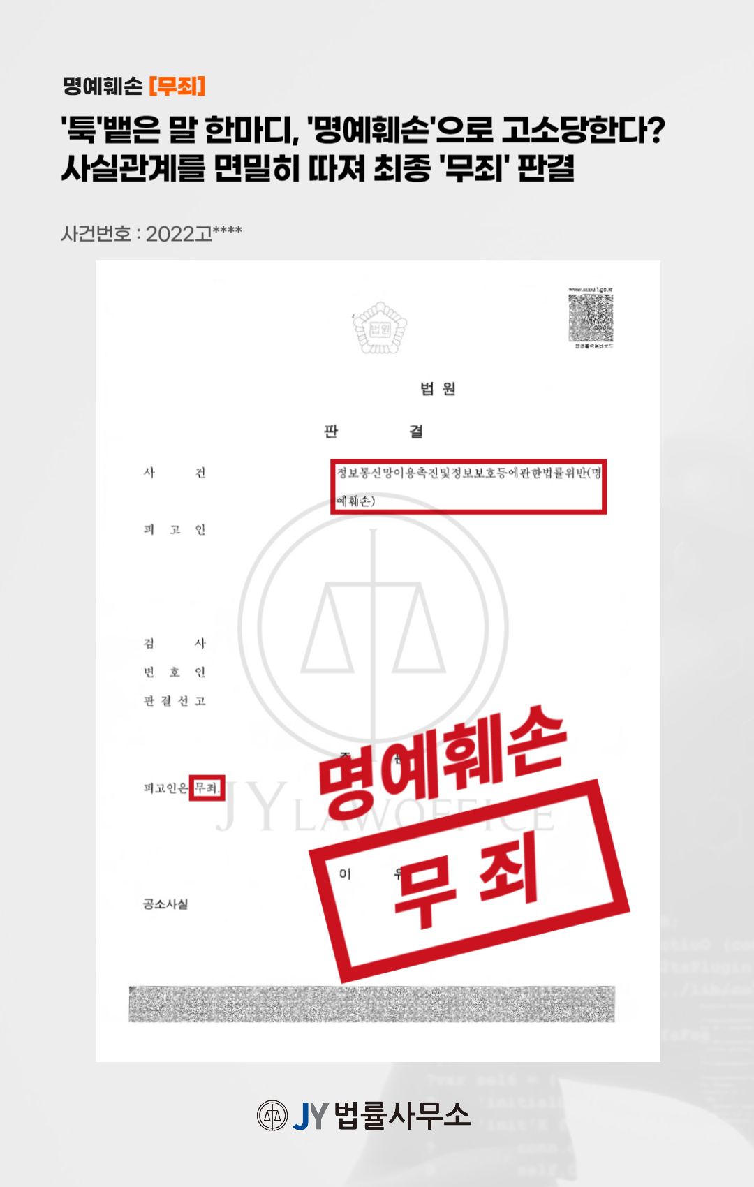 본 사건의 의뢰인은 상대방에 관련된 글을 인터넷 사이트에 게시함으로써, '명예훼손'혐의가 적용되었고, 이를 바로잡기 위해 본 JY법률사무소를 찾아와 주셨습니다.