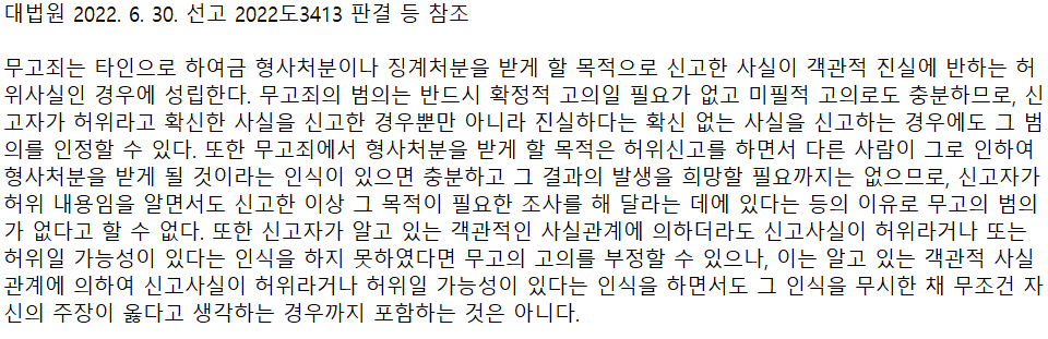 무고죄가 성립하는지 여부는 우리 판례에서 잘 설명을 하고 있는데요. 판례는 '무고죄에서 형사처분을 받게 할 목적은 허위신고를 하면서 다른 사람이 그로 인하여 형사처분을 받게 될 것이라는 인식이 있으면 충분하다'고 판시하고 있습니다.