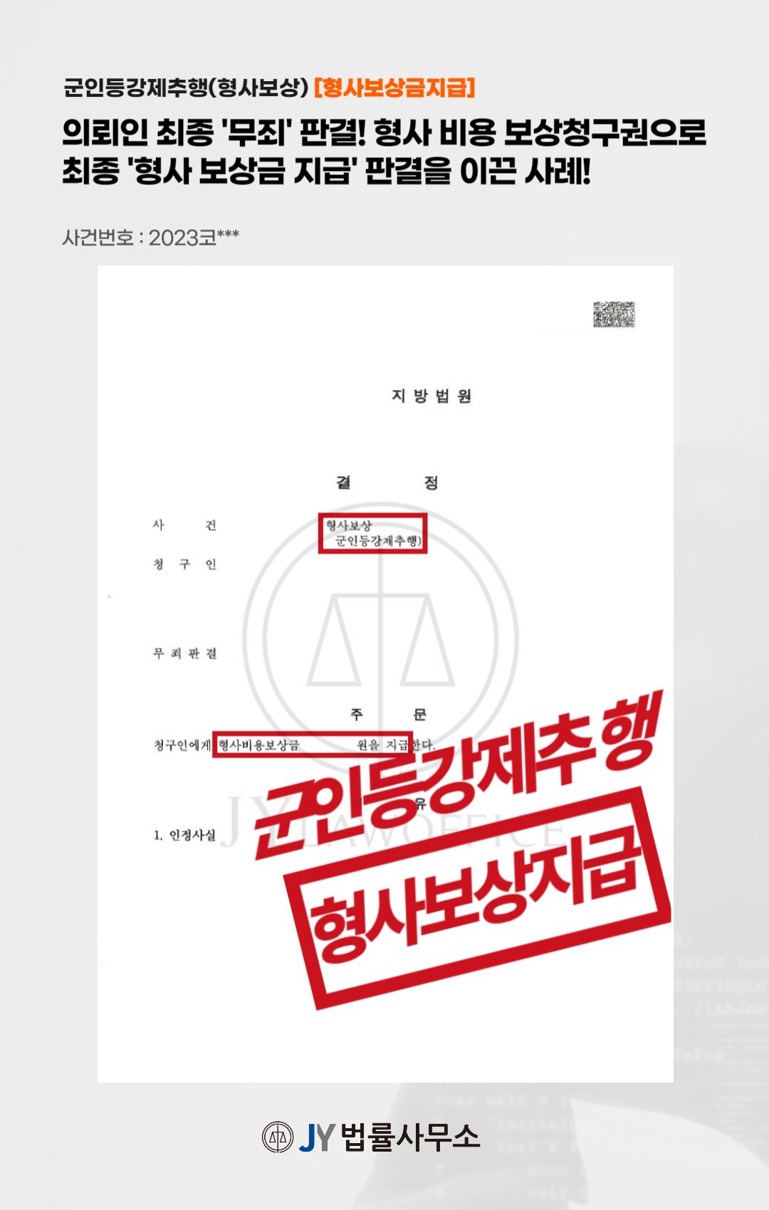 본 사건의 의뢰인은 '군인등강제추행' 혐의에 대해 총 2심의 재판을 진행하였고, 본 변호인의 조력으로 최종 '무죄'를 판결받았습니다. 이에 본 JY법률사무소는 의뢰인이 재판에 소요된 비용의 보상을 청구할 수 있도록 도움 드렸습니다.