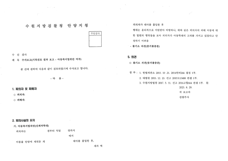 의뢰인도 자녀와 같은 공간에서 생활하면서 대마를 흡연한 것은 부모로서 잘못된 행동이었음을 인정하고 깊이 반성하고 있었습니다. 다만 의뢰인은 자녀와 공간적으로 분리된 상태에서 대마를 흡연했고, 자녀를 실질적인 위험에 노출시킨 적은 없었습니다. 부모로서 부적절한 행동이 있었다는 것과 그것이 형사처벌의 대상인 아동복지법위반에 해당하는지는 별개의 문제였고, 사건을 검토한 결과 의뢰인의 행위가 아동복지법위반의 구성요건에 해당하기 어렵다고 판단하여 검찰에 변호인 의견서를 제출했습니다.
