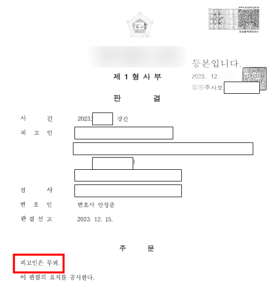 의뢰인에게 무죄를 선고한 사건입니다.