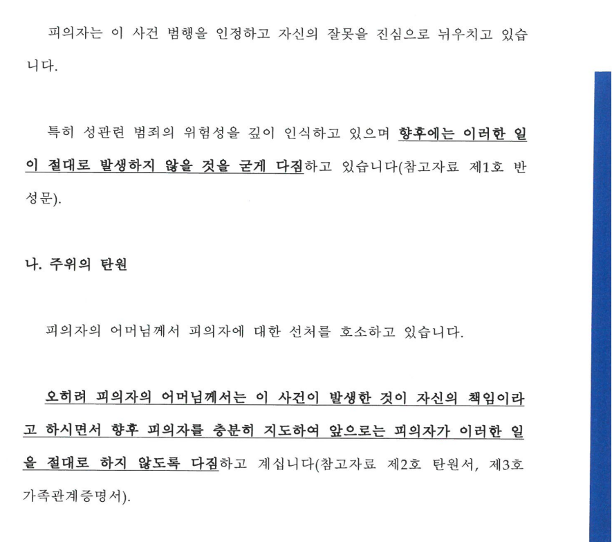 - 우선 피의자가 초범이고 피해자측과의 원만한 합의 및 변론을 진행할 경우 기소유예의 선처도 가능한 사건이라고 판단, 그에 따라 피해자측 변호인과의 합의시도를 통해 원만한 합의를 이끌어내었으며, 이후 이와 같은 사정과 더불어 의뢰인분의 양형에 대한 사정들을 바탕으로 선처를 구하는 취지의 변호인 의견서를 작성하여 수사기관에 제출하였습니다.