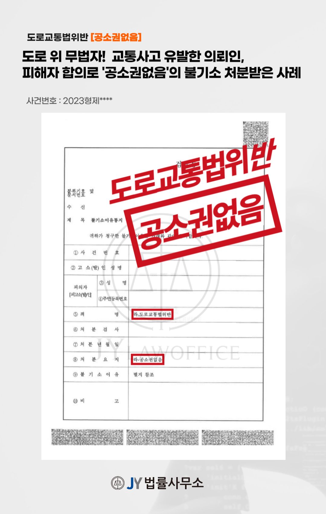 이와 같은 변호인의 조력에 따라, 의뢰인은 '공소권 없음'의 불기소 처분을 받고 사건을 마무리할 수 있었습니다.