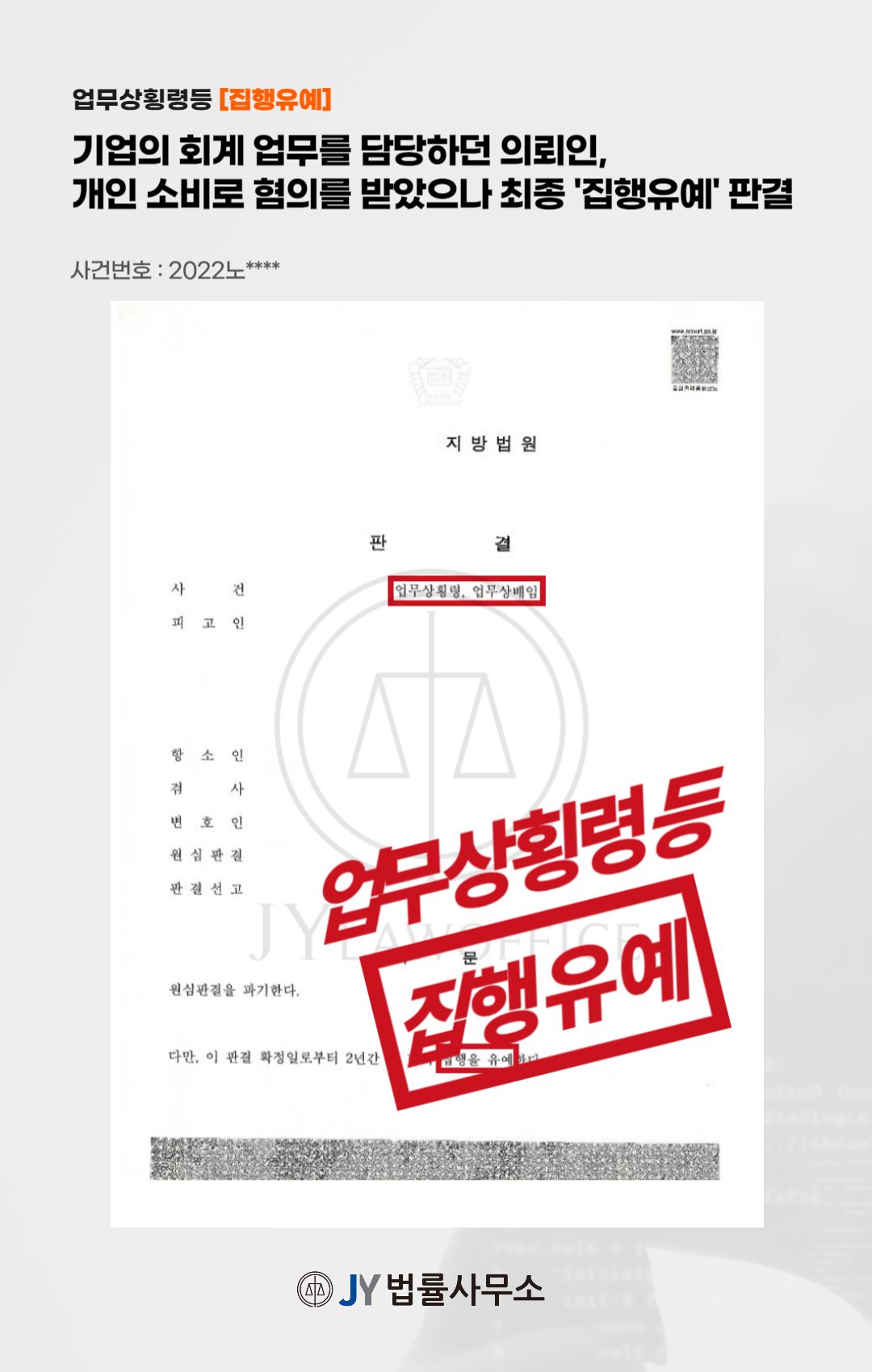 이와 같은 변호인의 노력에 따라, 의뢰인은 '업무상횡령', '업무상배임' 혐의에 대해 최종 집행유예를 선고받고 무사히 사건을 종결시킬 수 있었습니다.