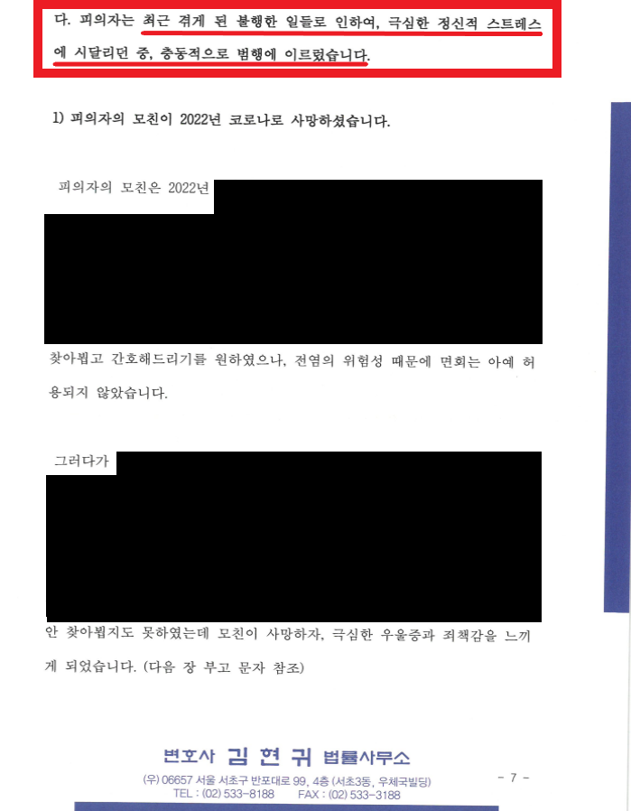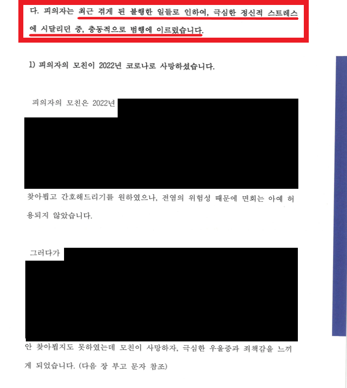 나. 피의자의 최근 연이어 불행한 일들을 겪게 되면서 극심한 정신적 스트레스 시달리던 중, 충동적으로 본 건 범행을 하였음.