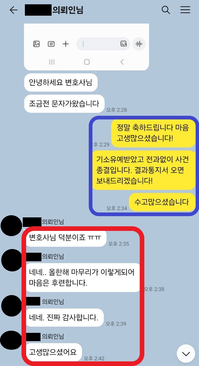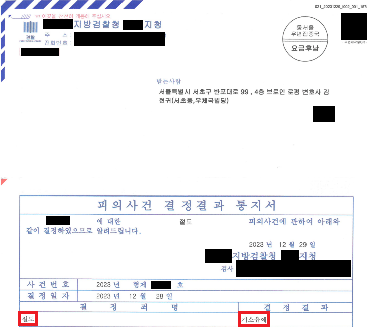 송치 결정문, 기소유예 결정문 등 사건 처분 결과 통지서 역시 변호인 사무실로만 오게 하여 다른 가족들이 모르게 종결하였습니다.