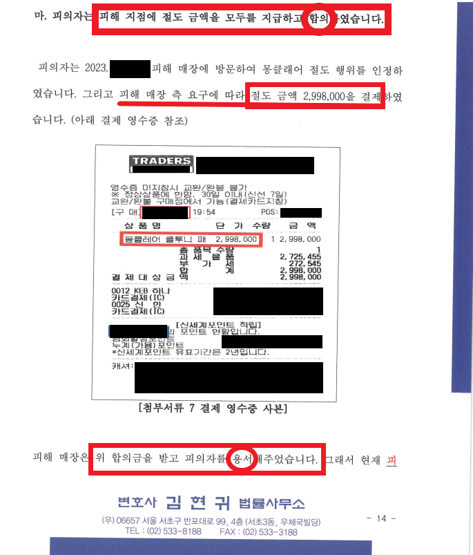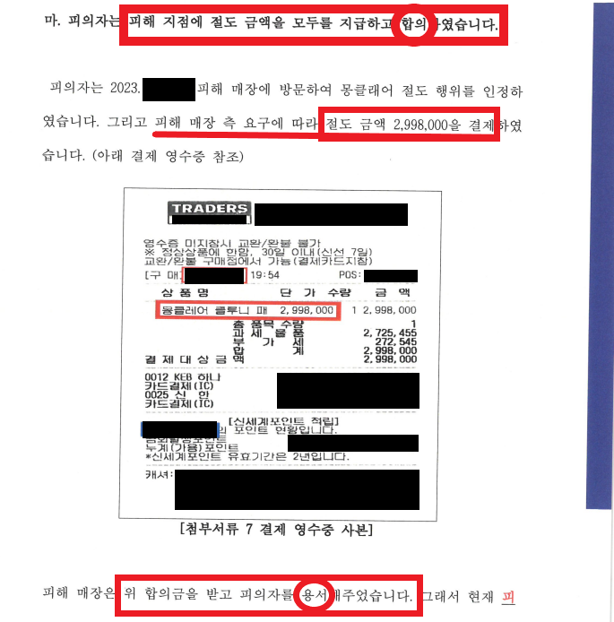다행히 긴 설득 끝에 보안팀장께서도, 결제를 하는 날 변호인이 가지고 간 합의서에 사인해주셨습니다. 그래서 의견서에 영수증뿐만 아니라, 합의서를 첨부할 수 있었습니다.