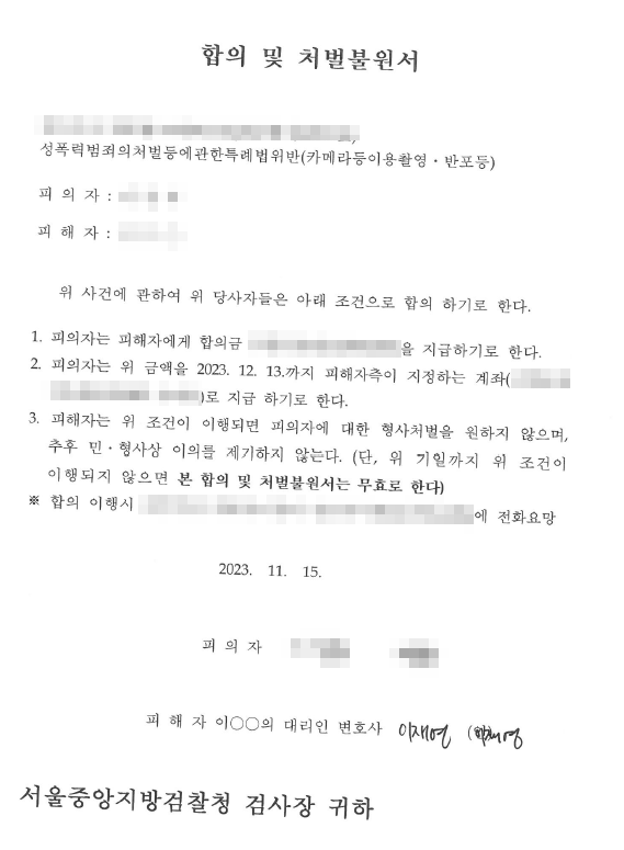 성폭력처벌법상 카메라등이용촬영죄의 피해자를 대리하여 피의자로부터 성공적으로 합의금을 받은 사례가 있어 소개해드리고자 합니다.