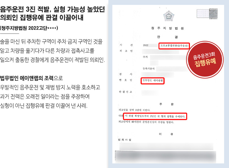 변호사의 철저한 변론으로 사건을 담당한 청주지방법원에서는 음주운전으로 3번째 적발된 의뢰인에게 실형이 아닌 집행유예라는 이례적인 판결을 내려주었습니다.