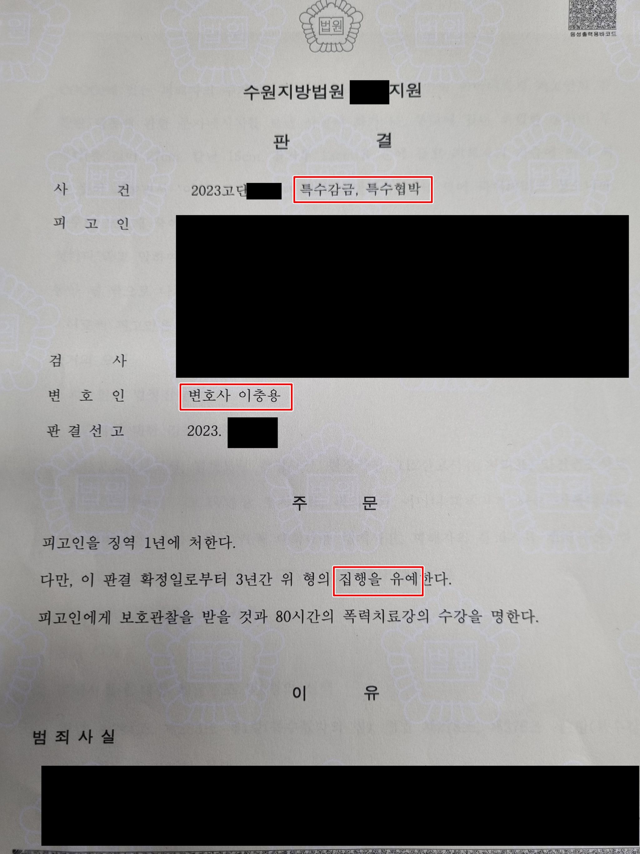 결국 이 사건 특수감금, 특수협박죄는 구속영장청구 기각, 집행유예 선고로 잘 마무리되었습니다.