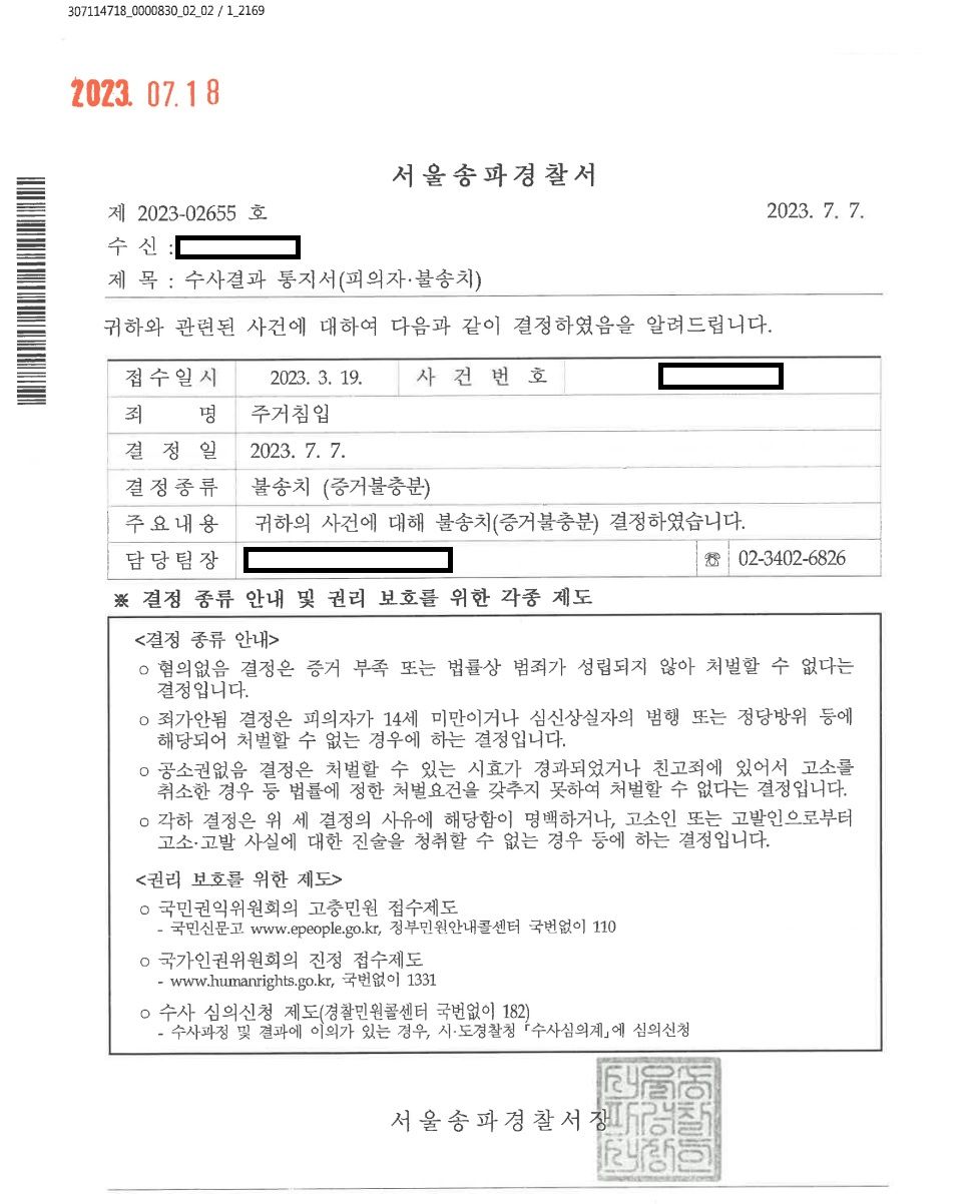 이러한 조력으로 인하여 주거침입에 대하여 불송치 결정을 받을 수 있었습니다.