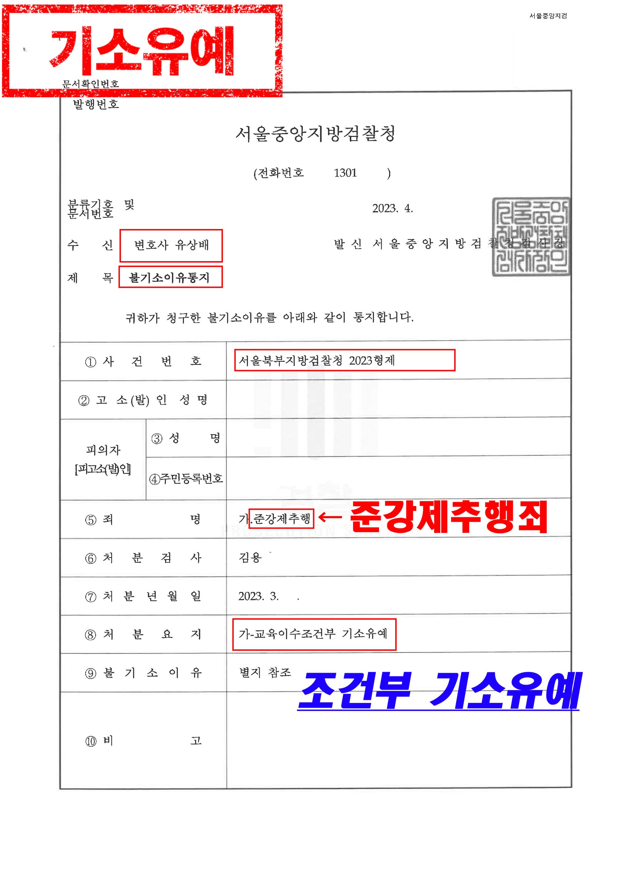 검찰에서도 피해자와의 원만한 합의, 의뢰인의 사건 후 대처 태도 그 외 여러 정상사항들을 두루 살핀 후, 변호인의 주장을 받아 들여 이번에 한하여 기소유예의 선처를 내려주었습니다.