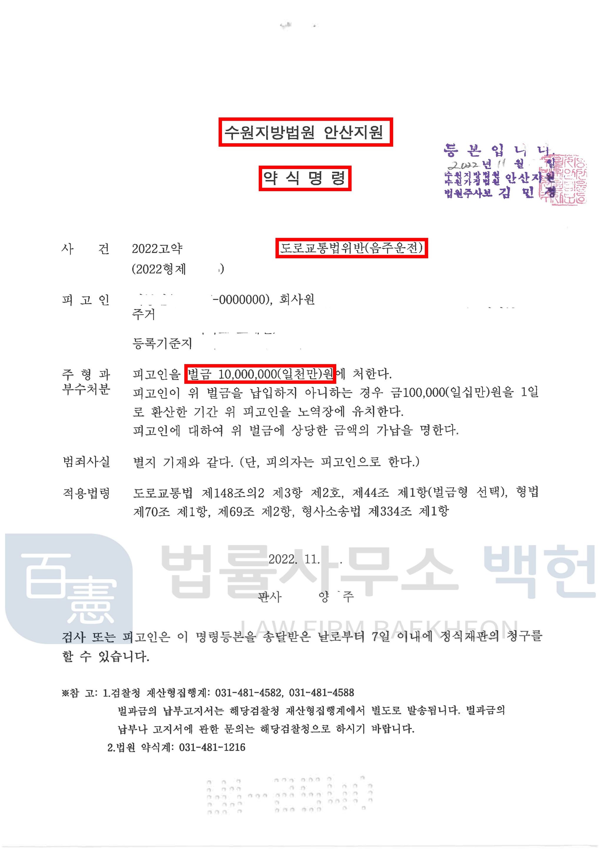 본 변호인은 의뢰인의 반성의 정도, 재범방지를 위한 노력, 운전 경위 중 참작할 부분 등 여러 정상참작자료들을 제출하면서 양형변론을 한 결과, 재판부도 이번에 한해 의뢰인에게 벌금형의 선처를 내려주었습니다.