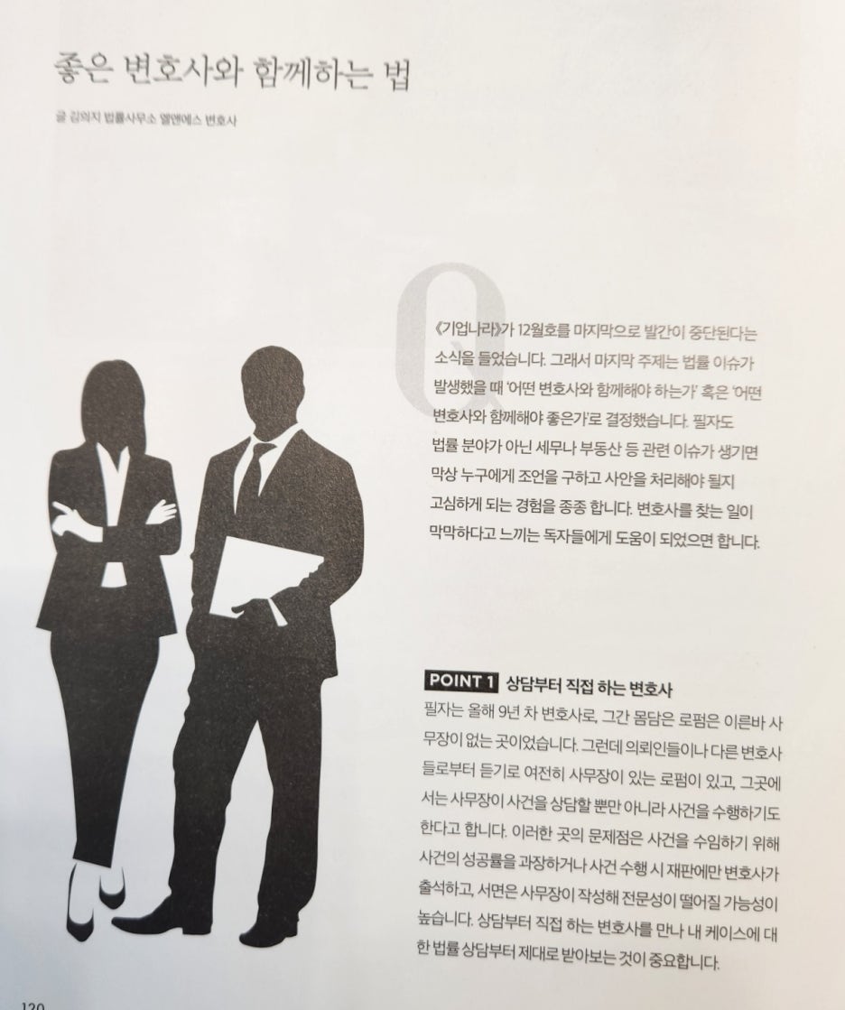 <기업나라>가 12월호를 마지막으로 발간이 중단 된다는 소식을 들었습니다. 그래서 마지막 주제는 법률 이슈가 발생했을 때 ‘어떤 변호사와 함께 해야 하는가’ 혹은 ‘어떤 변호사와 함께 해야 좋은가’로 결정했습니다. 필자도 법률 분야가 아닌 세무나 부동산 등 관련 이슈가 생기면 막상 누구에게 조언을 구하고 사안을 처리해야 될지 고심하게 되는 경험을 종종 합니다. 변호사를 찾는 일이 막막하다고 느끼는 독자들에게 도움이 되었으면 합니다.