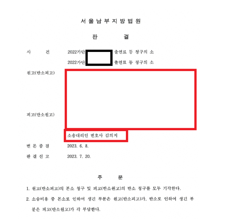 이 사건은 다큐멘터리 영화 촬영 중 배우와 감독 간 발생한 분쟁으로서 원고의 근거 없는 출연료 지급청구 등에 잘 방어한 사례입니다. 원만한 마무리를 위해 분쟁 초기에 합의를 시도하였으나 합의가 되지 않아 결국 재판까지 갔던 사안이었습니다. 의뢰인은 원고와의 분쟁으로 인하여 커리어에 심각한 피해를 입을 것을 염려하였으나, 원고의 청구를 기각시킴으로써 걱정을 멈출 수 있었습니다.