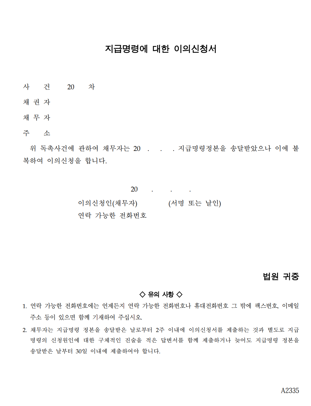 지급명령에 대한 이의신청은 지급명령 송달일로부터 2주 내에 하셔야 됩니다.