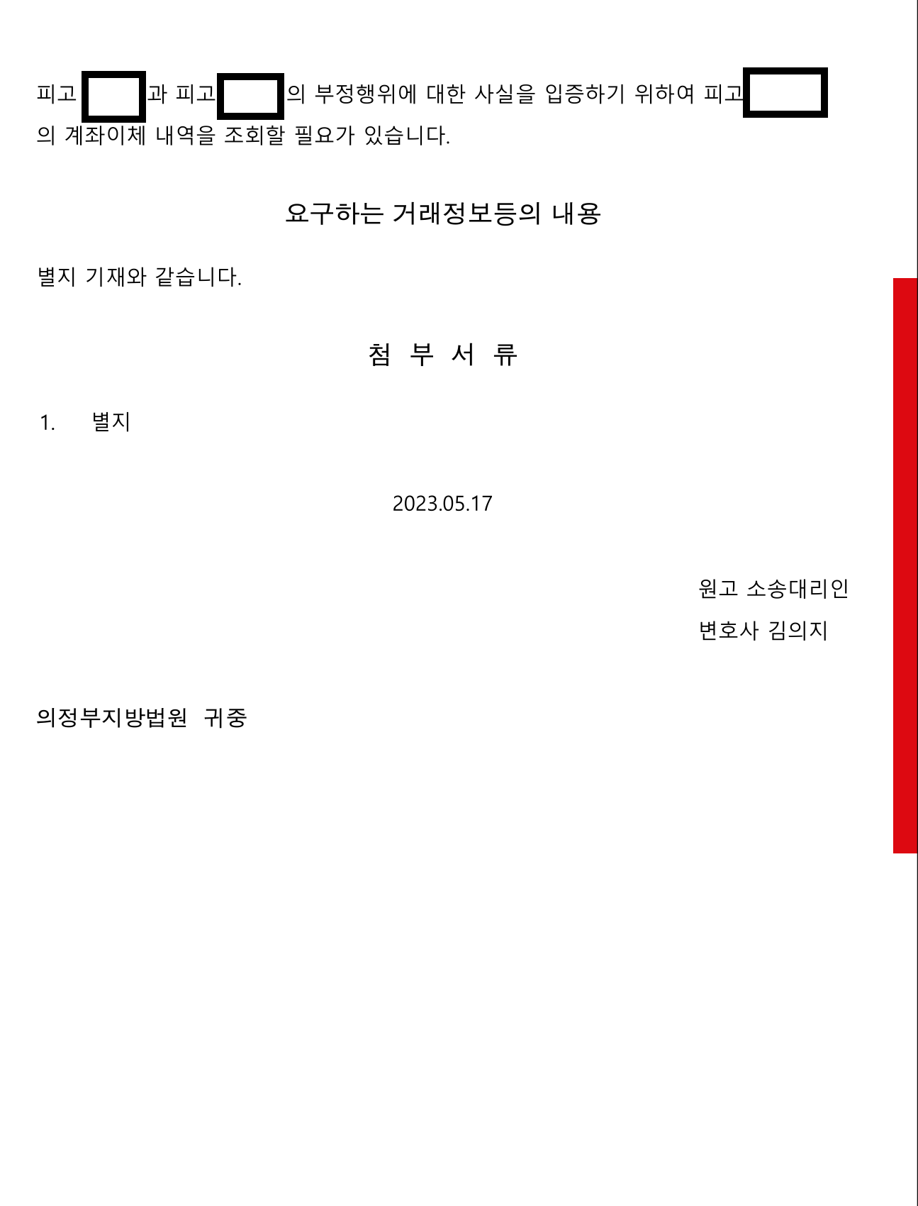 피고(들)의 부정행위에 대한 사실을 입증하기 위하여 피고의 계좌이체 내역을 조회할 필요가 있습니다.