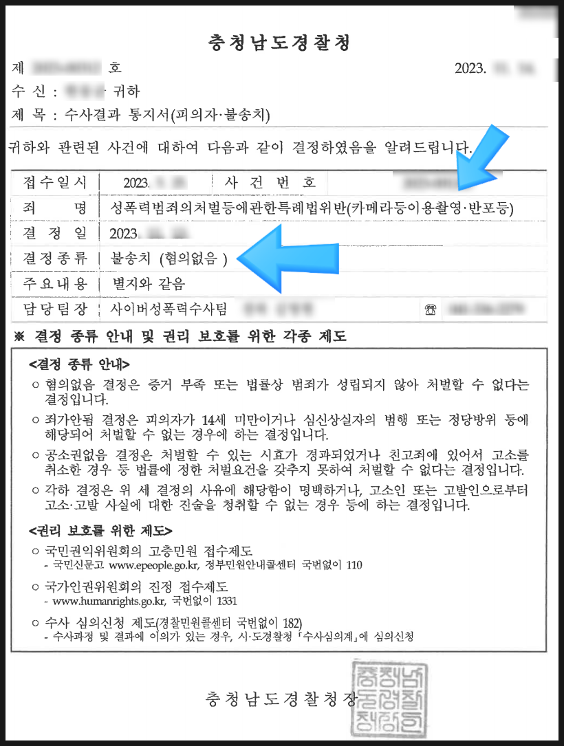 이외에도 여러 양형 자료를 제출한 결과, 의뢰인은 카메라등이용촬영/반포에 대하여 경찰단계에서 혐의없음 결정을 받게 되었습니다.