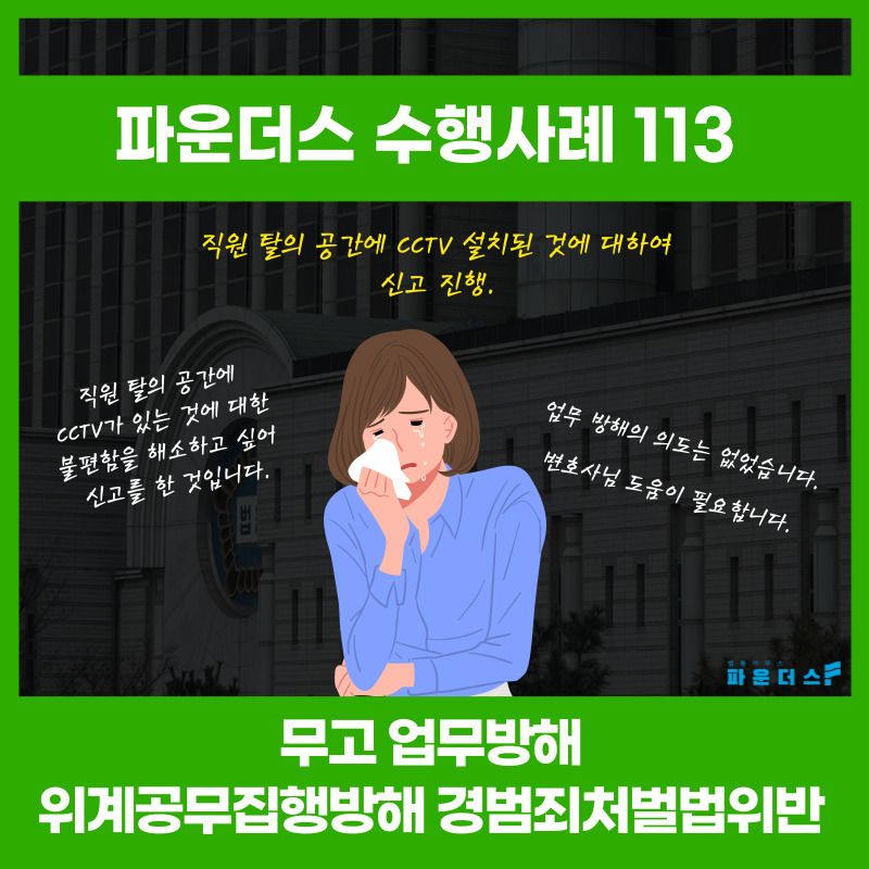 의뢰인은 자신이 근무하는 직장 탈의실에 CCTV가 설치되어 있다는 민원을 넣었습니다. 이와 같은 민원제기 이후 직장 측에서는 의뢰인에 대하여 허위사실을 적시한 민원을 제기했다는 이유로 업무방해와 위계공무집행방해 그리고 경범죄처벌법위반으로 고소를 하였고 이에 억울함을 느낀 의뢰인은 파운더스 변호인의 조력을 요청하게 되었습니다.