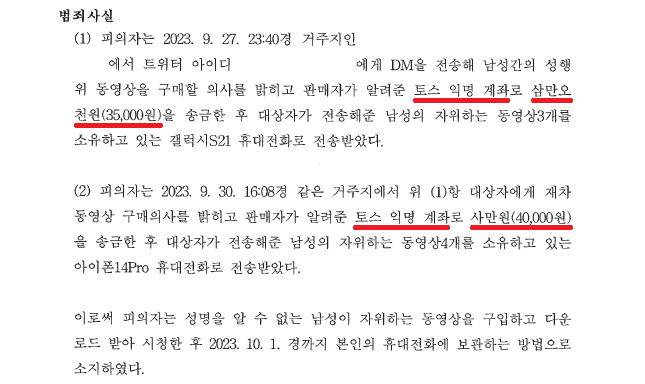 성소수자 A씨는 2023. 9.경 트위터에서 B씨가 게시한 '게동(게이 동영상)'을 판매한다는 광고글을 보고 B씨에게 연락하여 구매 의사를 밝혔습니다. 그랬더니 B씨가 샘플이라며 썸네일 사진 몇 장을 보내주었는데, 남성이 영상통화를 하며 자위행위를 하는 모습을 몰래 촬영한 '몸캠' 동영상이었습니다. A씨는 B씨가 알려주는 토스 익명 계좌로 35,000원, 40,000원을 각 계좌이체한 뒤 B씨로부터 '몸캠' 동영상 3개, 4개를 각 전송받아 소지하였습니다.