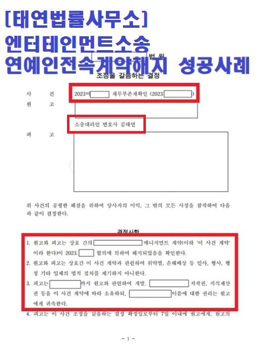 엔터테인먼트 소송에서 타의 추종을 불허하는 압도적인 사건의 경험이 있으신만큼 변호사님께서는 신속하고 치밀하게 움직이셨고 엔터계약해지 사건은 재판부의 결정으로 조정에 회부되었습니다. 조정에 앞서 청구 취지 변경을 진행하였고 회사측에서는 태연법률사무소의 요구 사항을 대부분 수용하는 조건을 제시하며 합의를 제안하였습니다.
